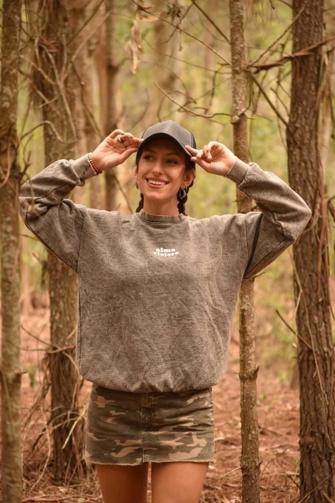 Tiene nuestro diseño Alma Viajera en la parte delantera y el sello de Indochina en la nuca. El buzo tiene el proceso de stone wash por eso queda gastado & súper canchero :)