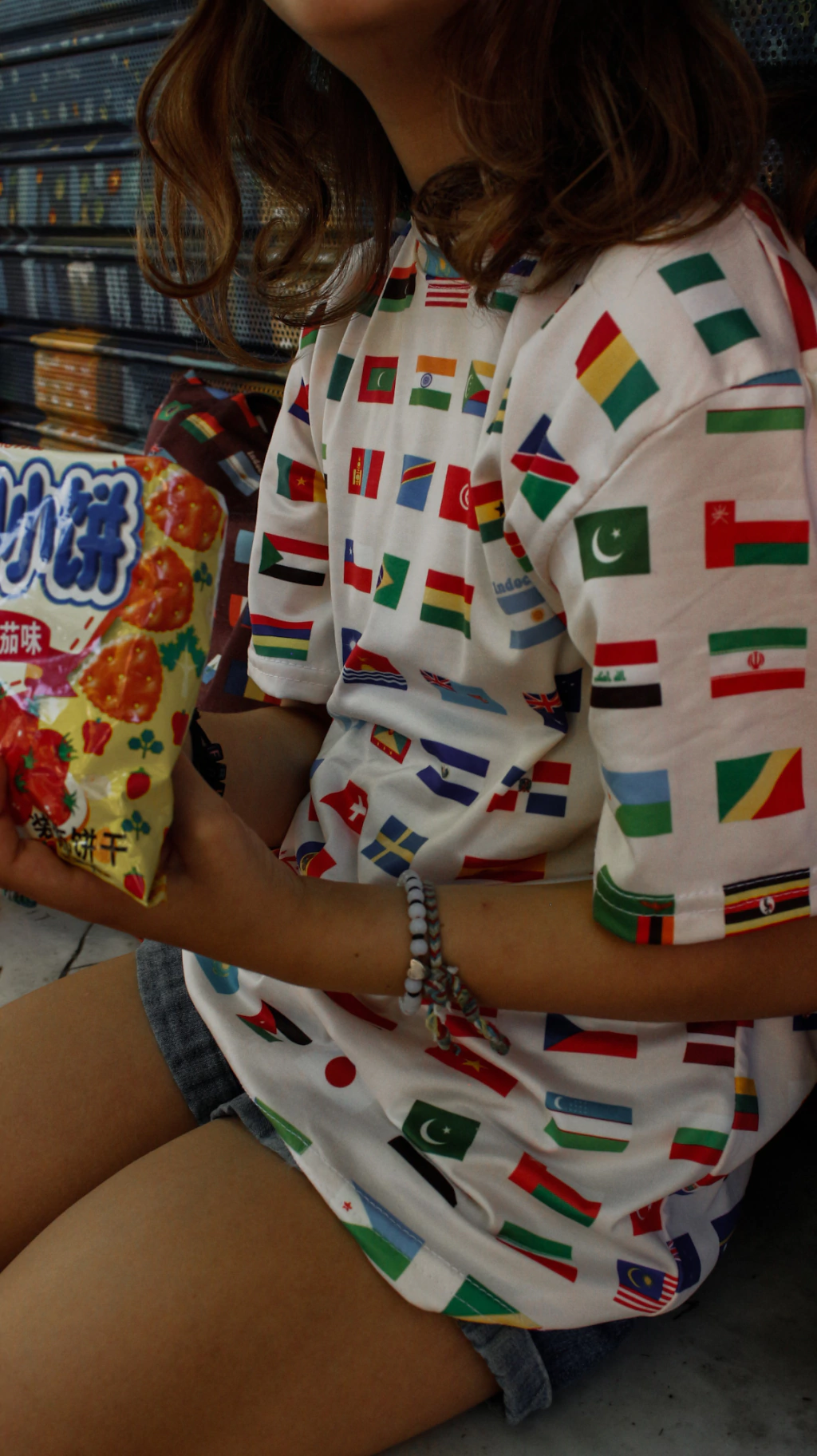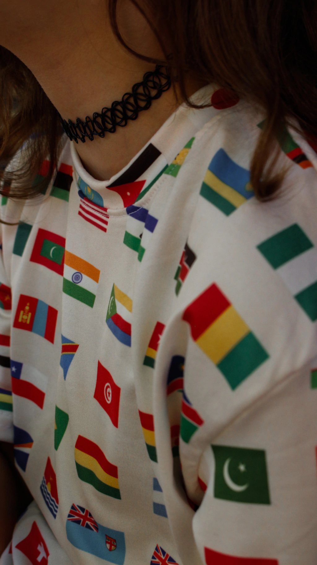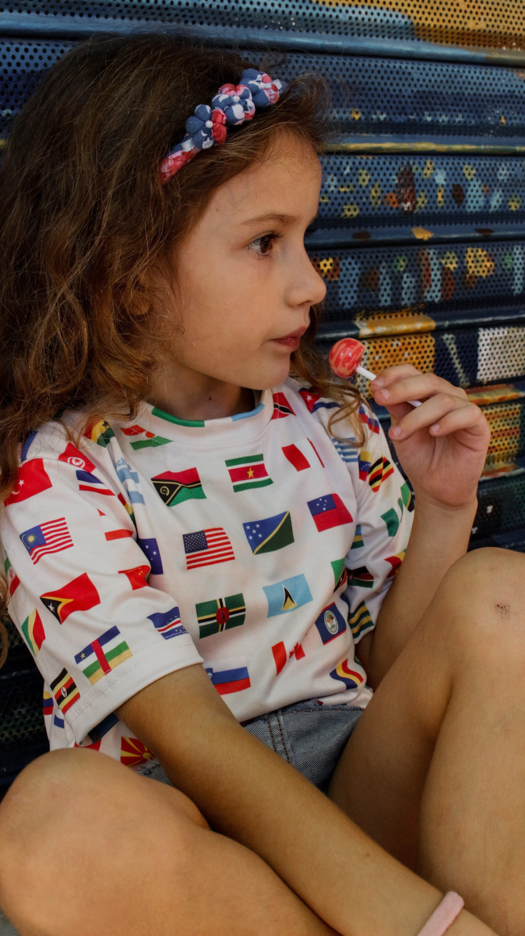 Remerita Indokids confeccionada en modal soft sublimada con nuestro diseño de Banderas con fondo natural.
