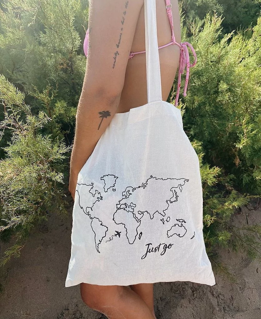 Bolsa de lienzo estampada con el Mapamundi Just Go en serigrafía.