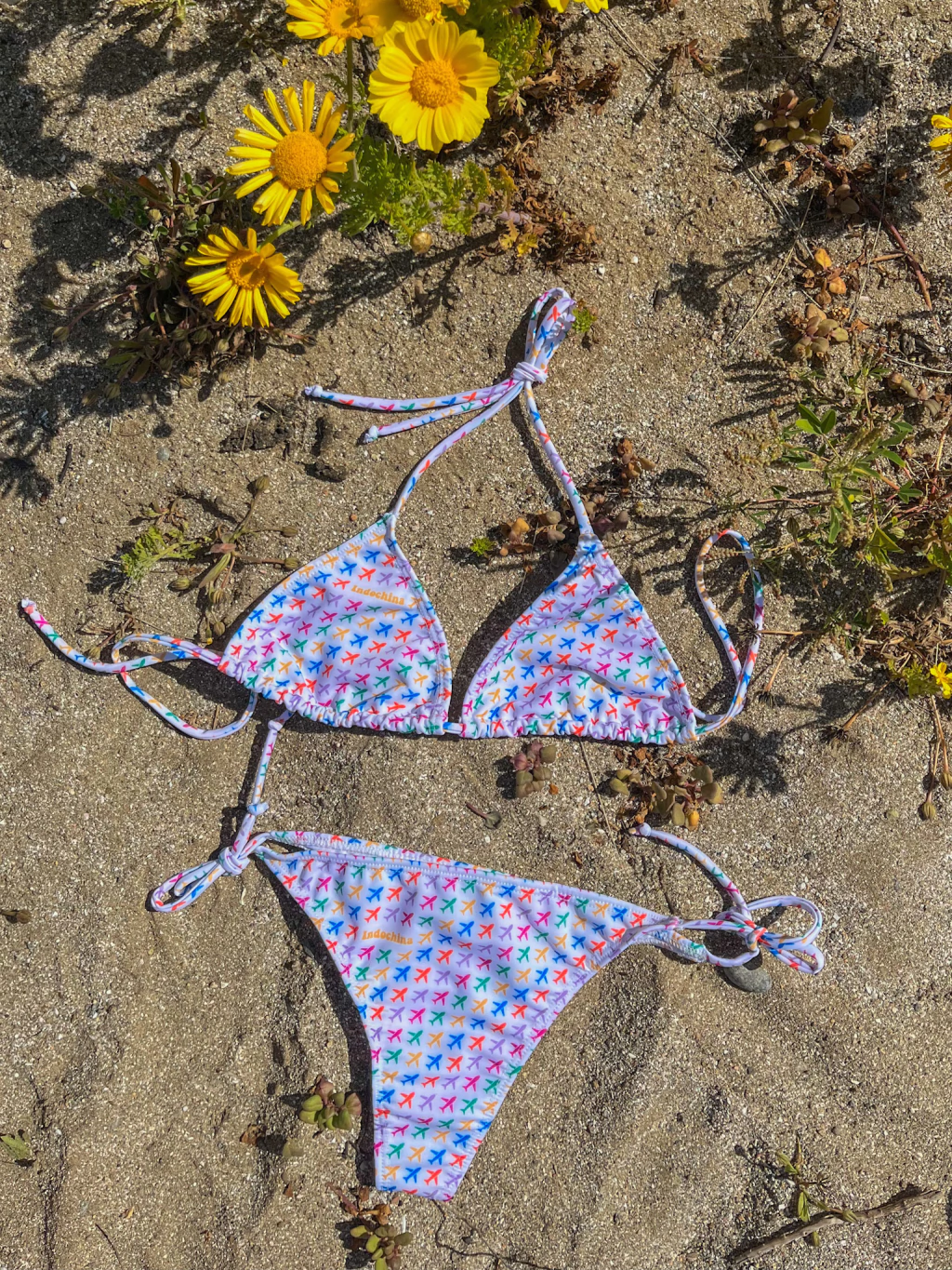 Conjunto bikini triangulito con nuestro diseño de avioncitos de colores: corpiño con formato triangular y tiras regulables y bombacha vedetina con tiritas en los laterales regulables. La bikini está confeccionada en lycra tricot y luego sublimado nuestro clásico diseño avioncitos que hace el conjunto del corpiño con la bombacha. El conjunto viene por talles: del S al XL con tiritas regulables y forrada por dentro (obvio). Se compra el conjunto del mismo talle pero si es necesario se puede cambiar sólo una parte del mismo.