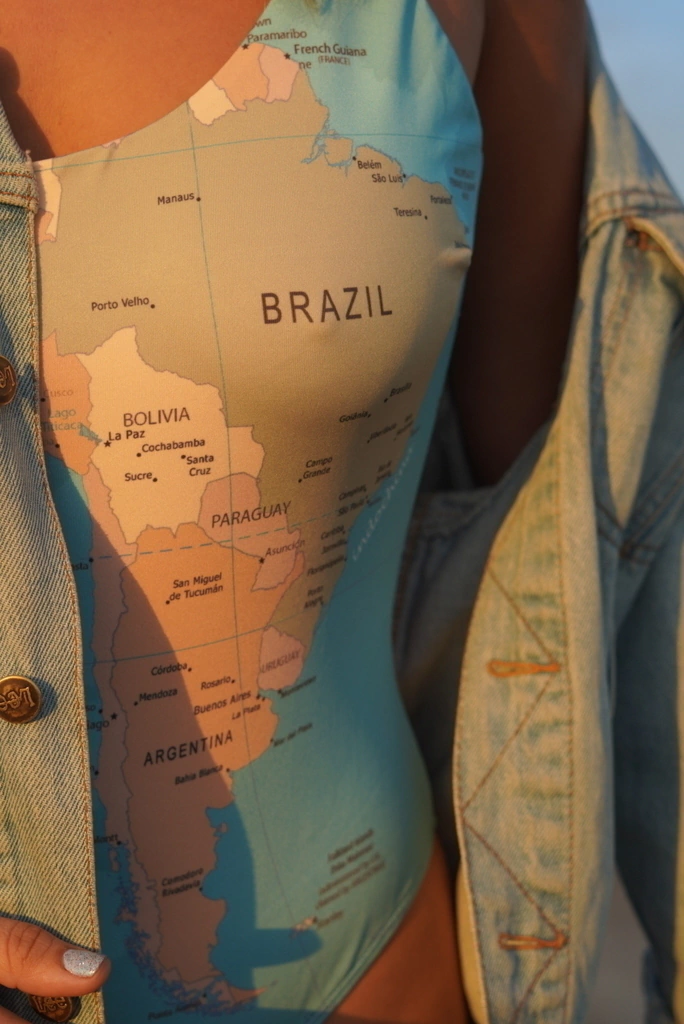 Malla enteriza con nuestro diseño mapamundi en tonos tierras y la parte de abajo vedetina. La enteriza está confeccionada en lycra tricot y luego sublimado nuestro clásico diseño mapamundi en tonos tierras. La malla entera viene por talles: del S al XL con tiritas regulables y forrada por dentro (obvio).
