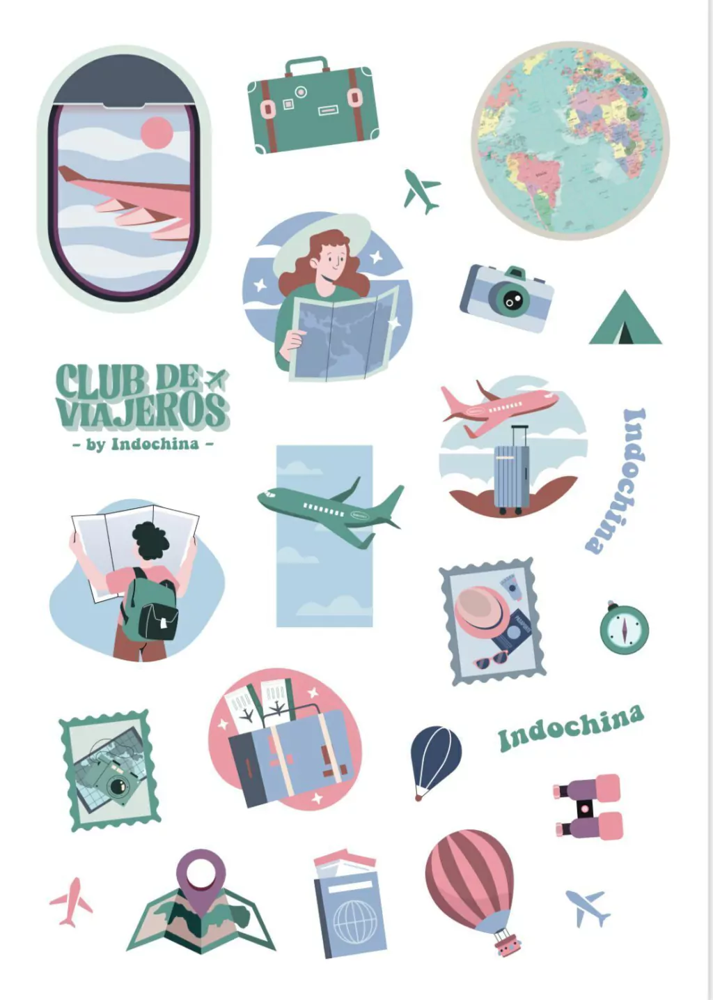Plancha de Stickers con los diseños del Club de Viajeros by Indochina.