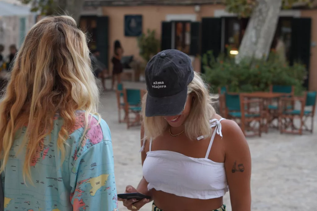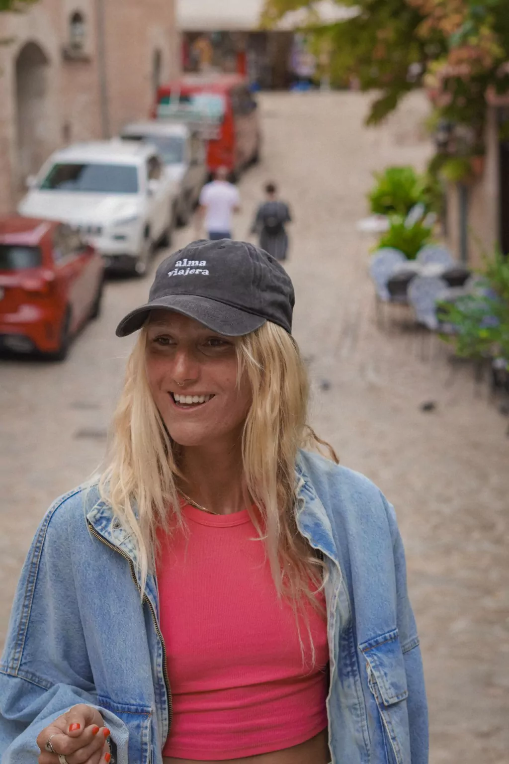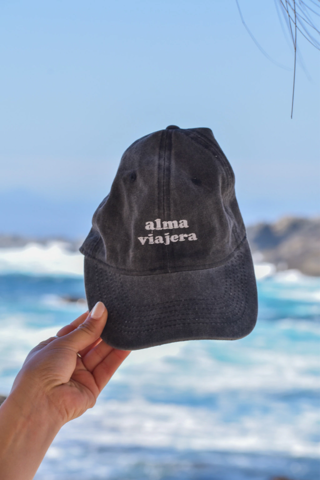Gorra de algodón gastado con bordado ALMA VIAJERA en blanco.