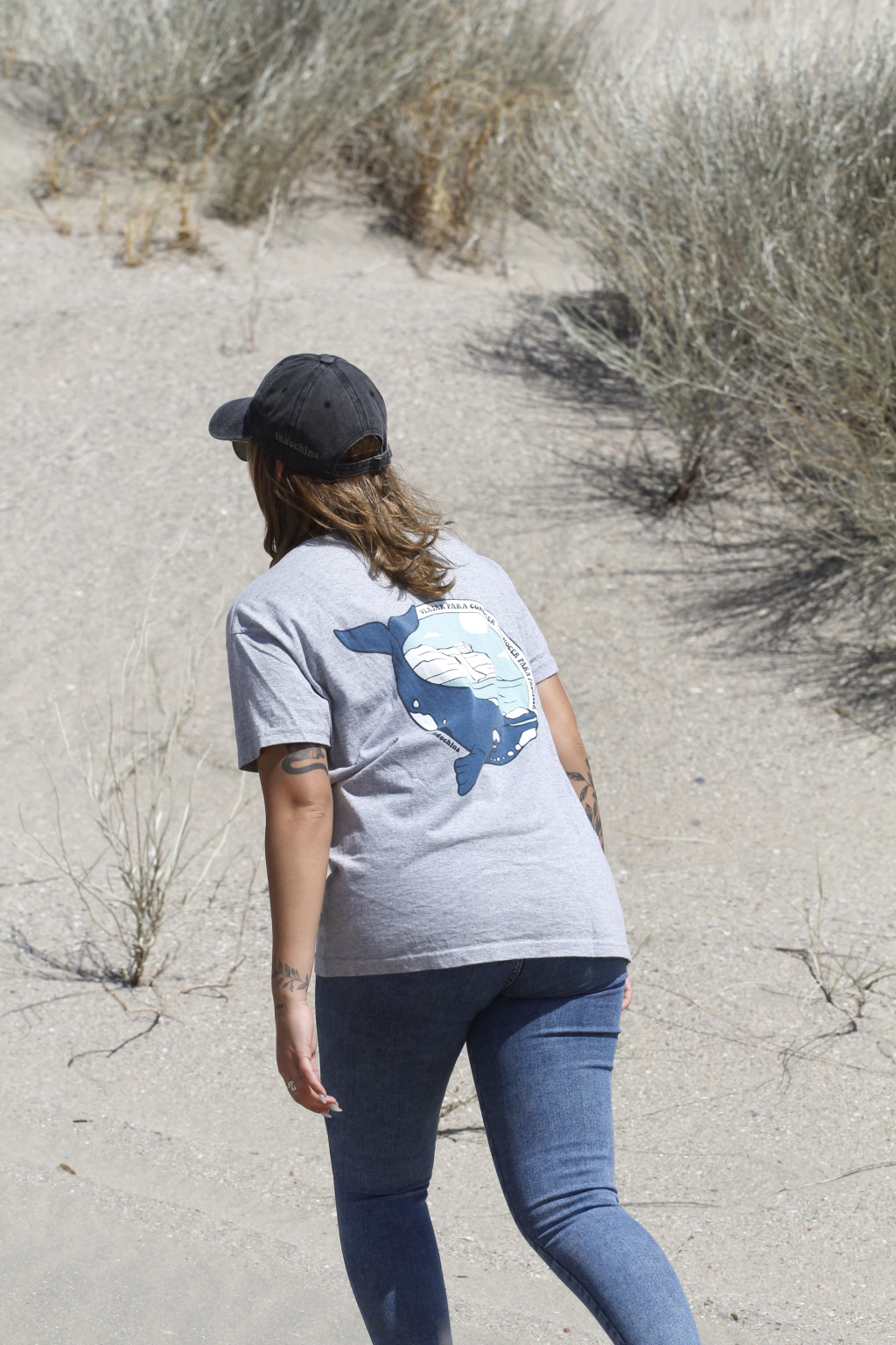 Remera gris melange de 100% algodón con estampa del diseño exclusivo de la Cápsula Indochina + Instituto de Conservación de Ballenas. Comprando esta prenda donas el 25% a la ONG.